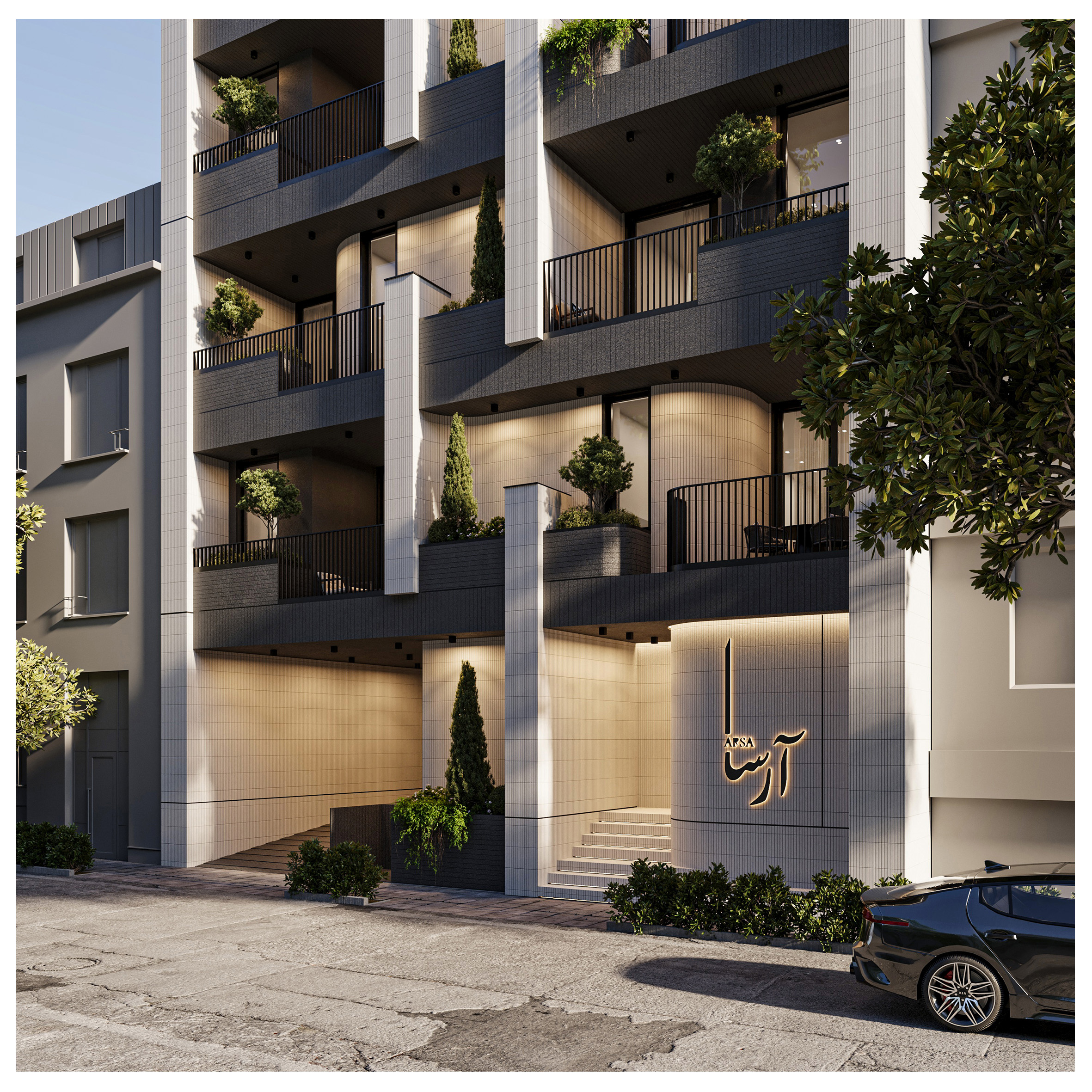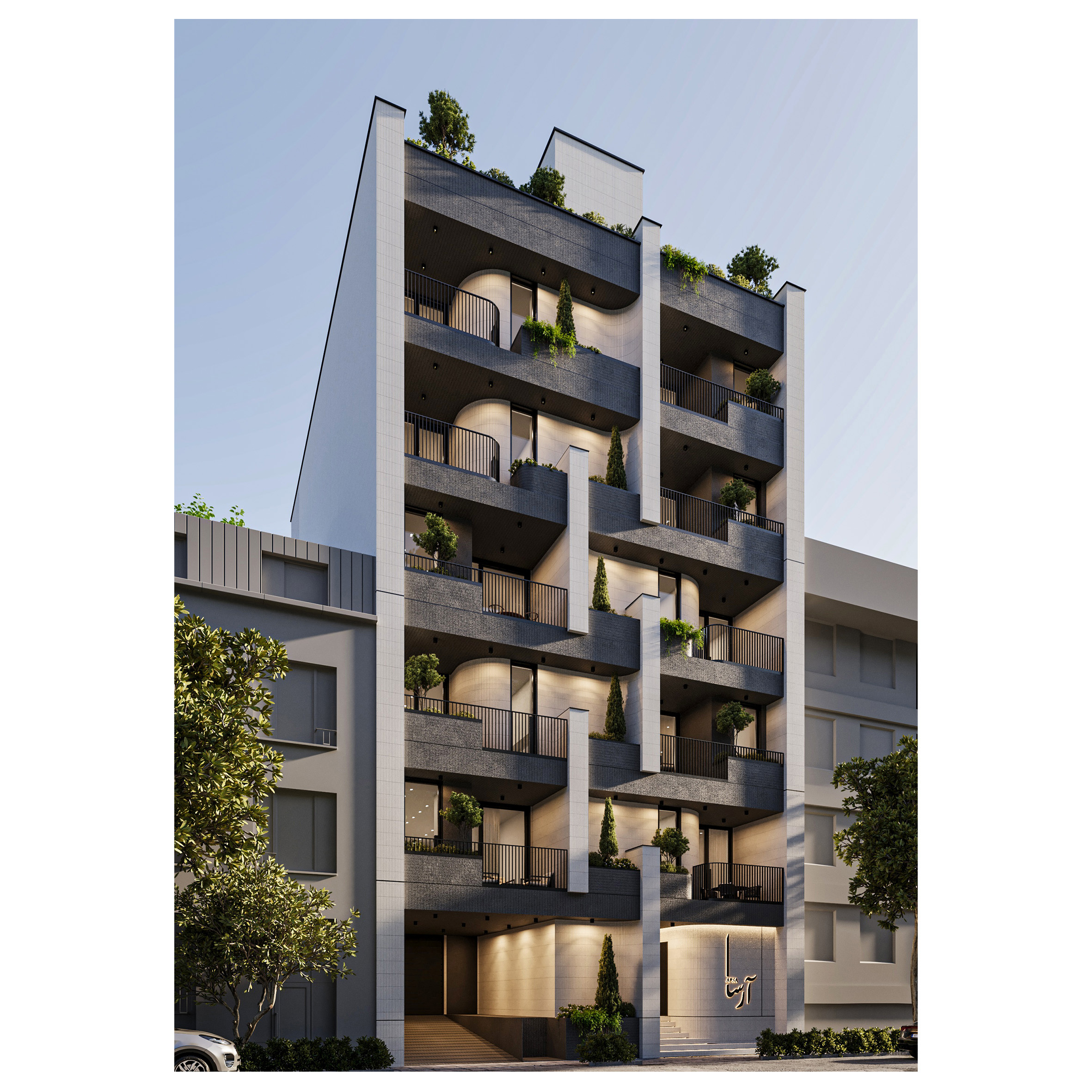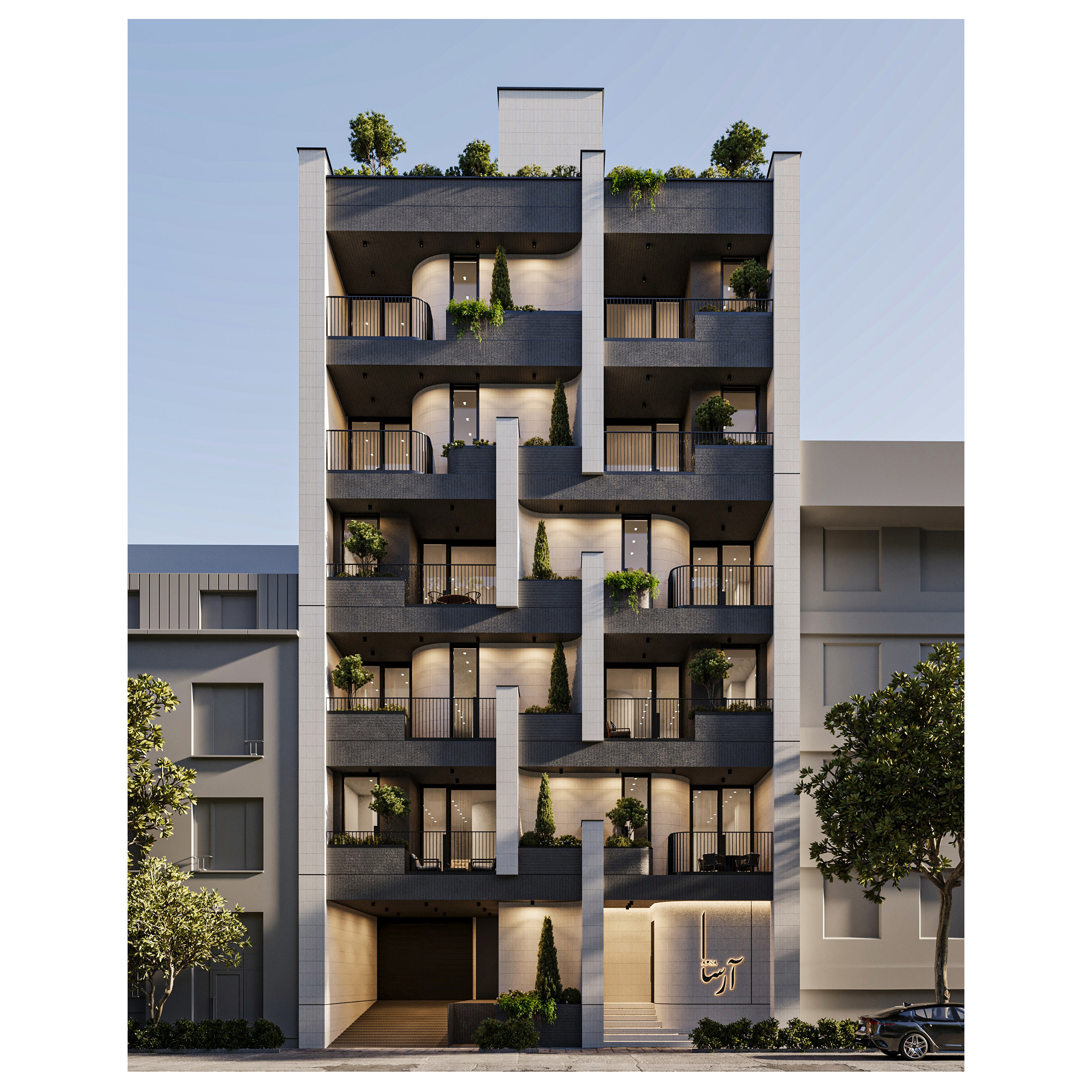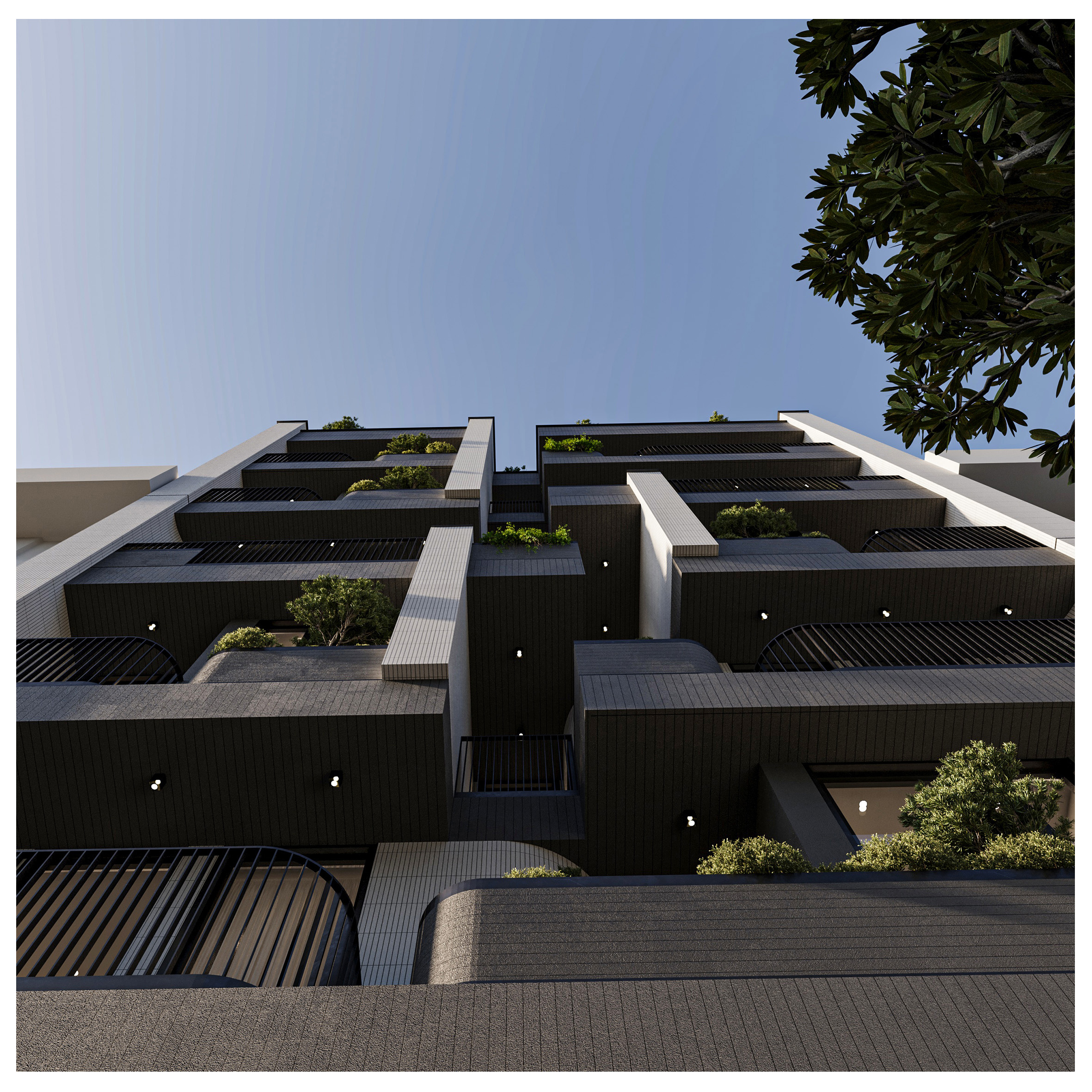 Arsa Apartment, housing two residential units on each floor, establishes a visual connection between the alleyway and the sky by utilizing vertical elements. Large, furnished terraces extend along the living space of the units and, in combination with greenery, create a pleasant experience of semi-open living continuously connected with nature. Furthermore, the project’s roof garden is designed as an extension of its facade, forming a unified and coherent whole in harmony with other elements.