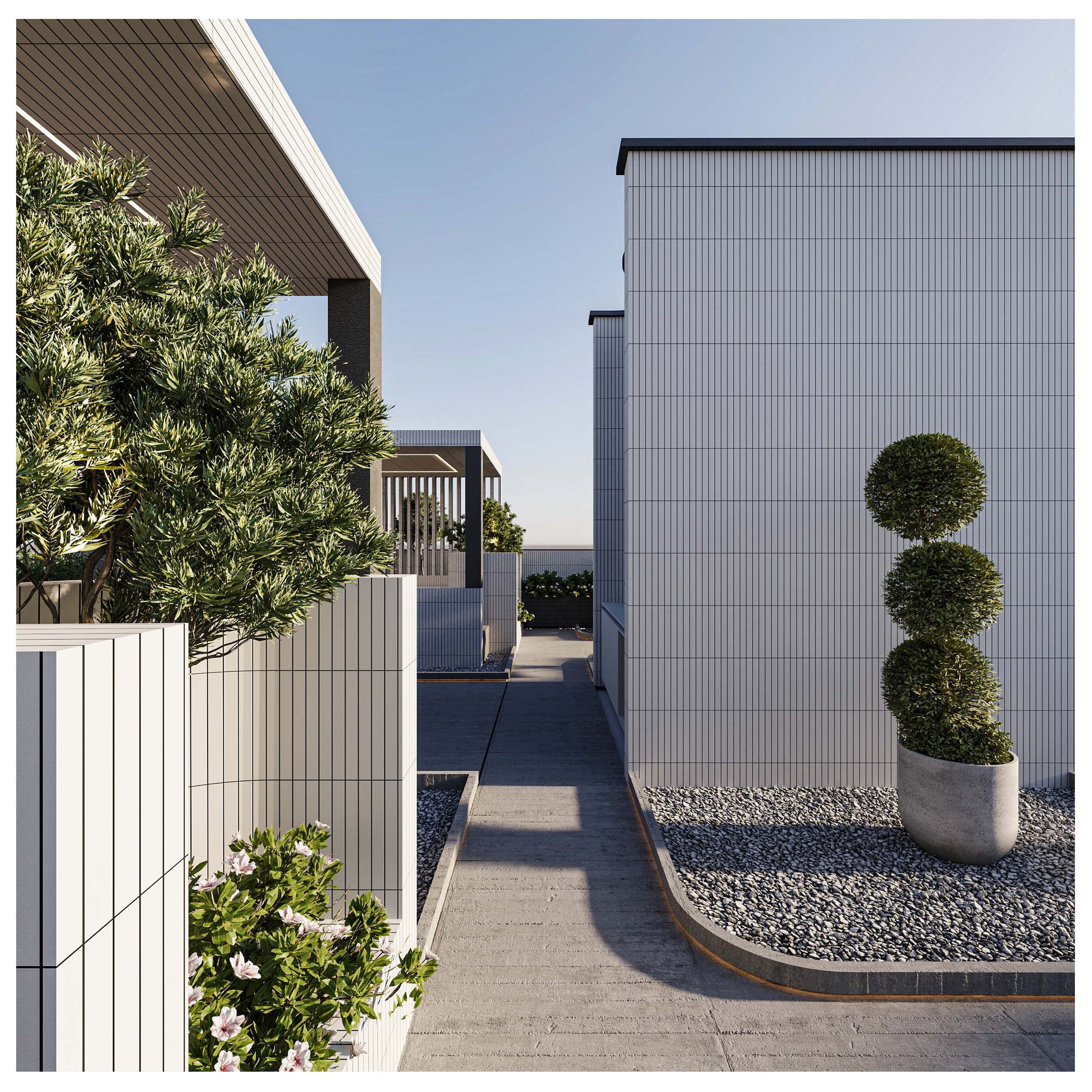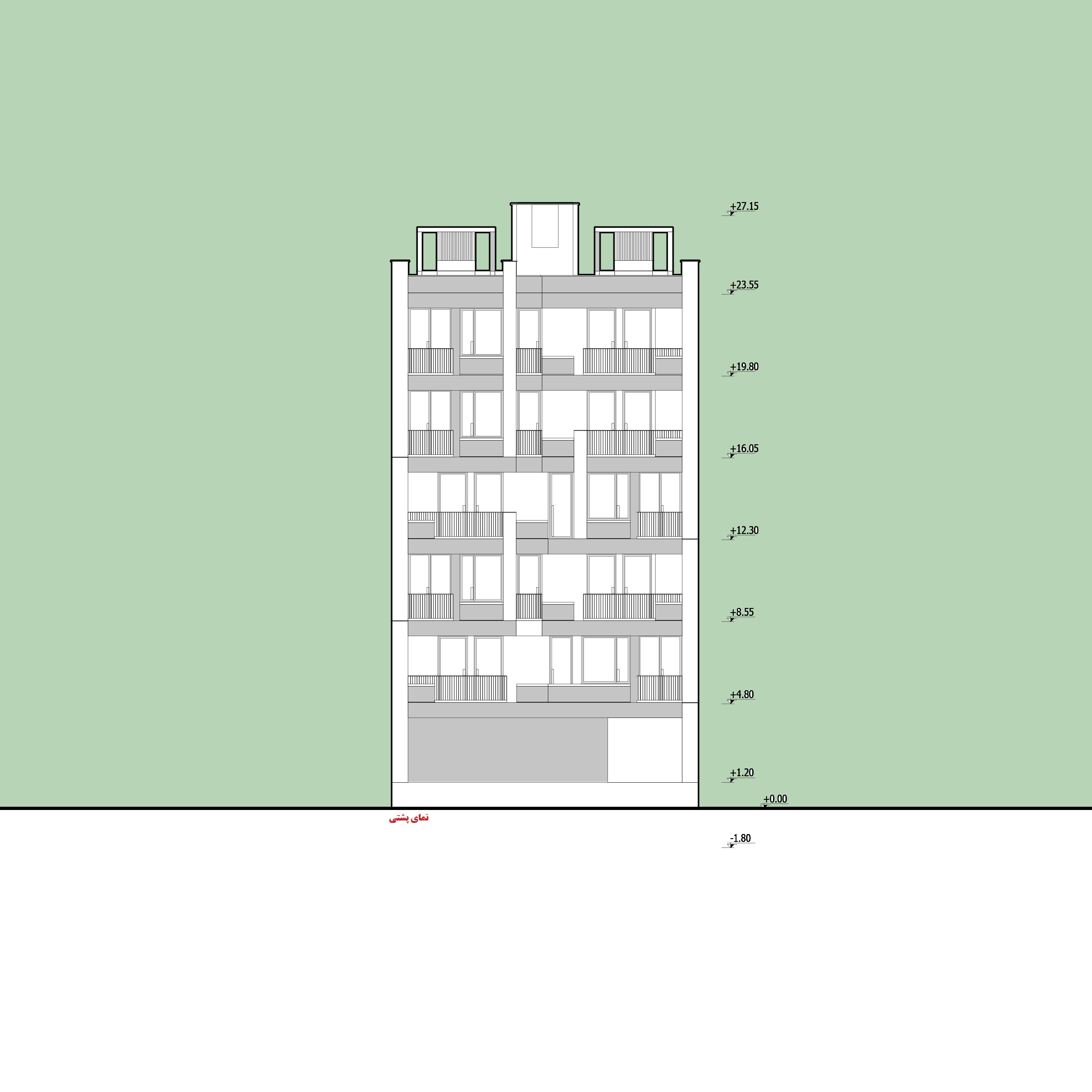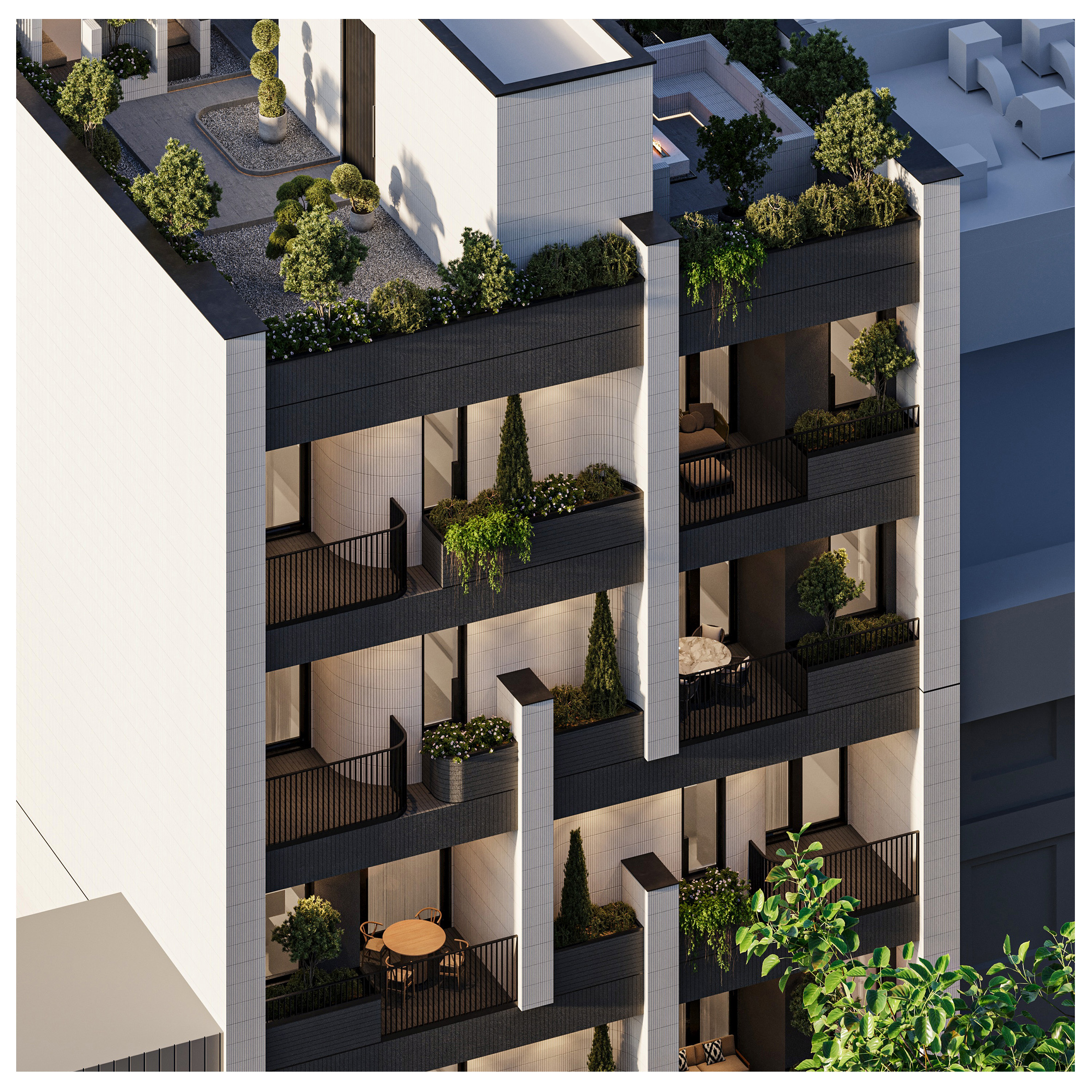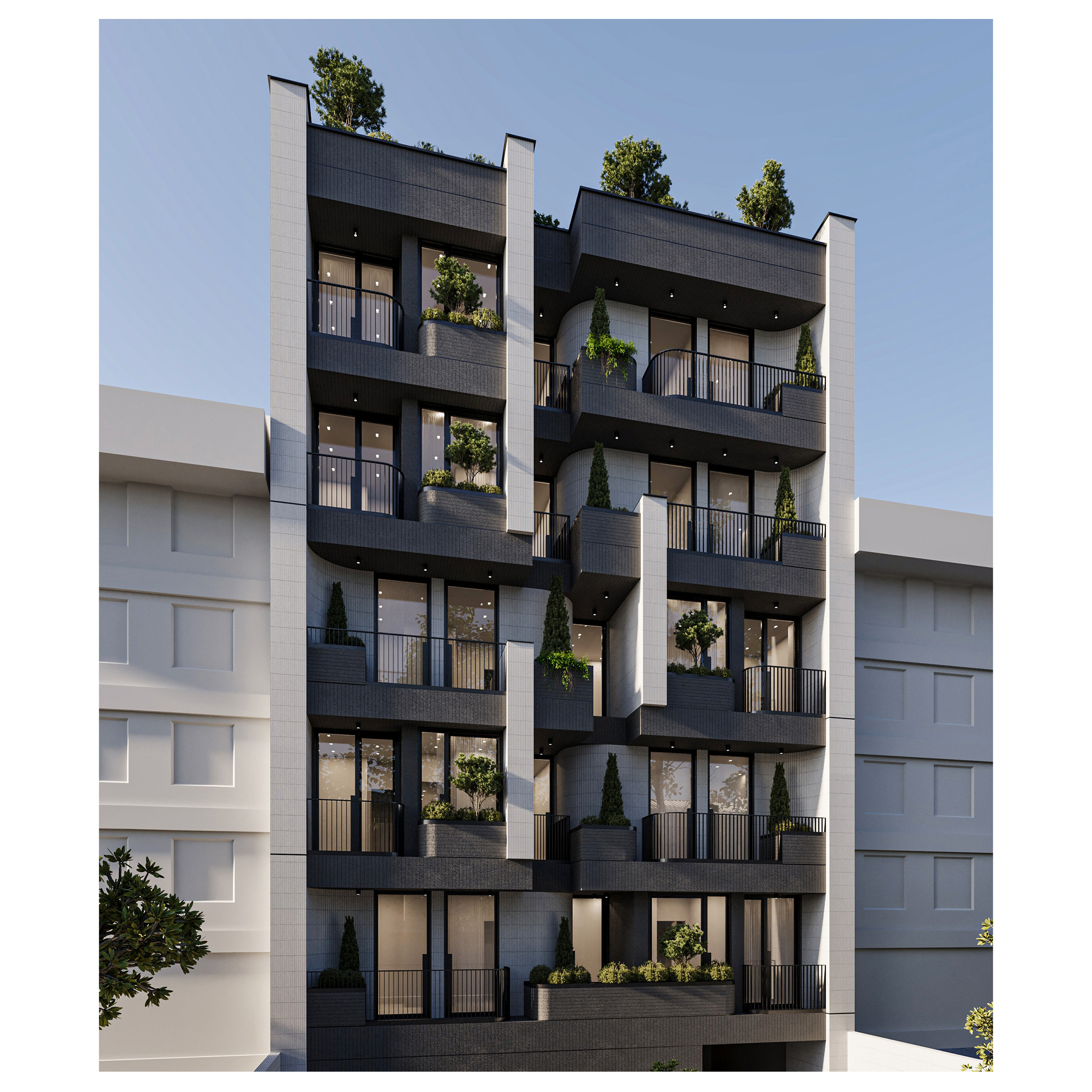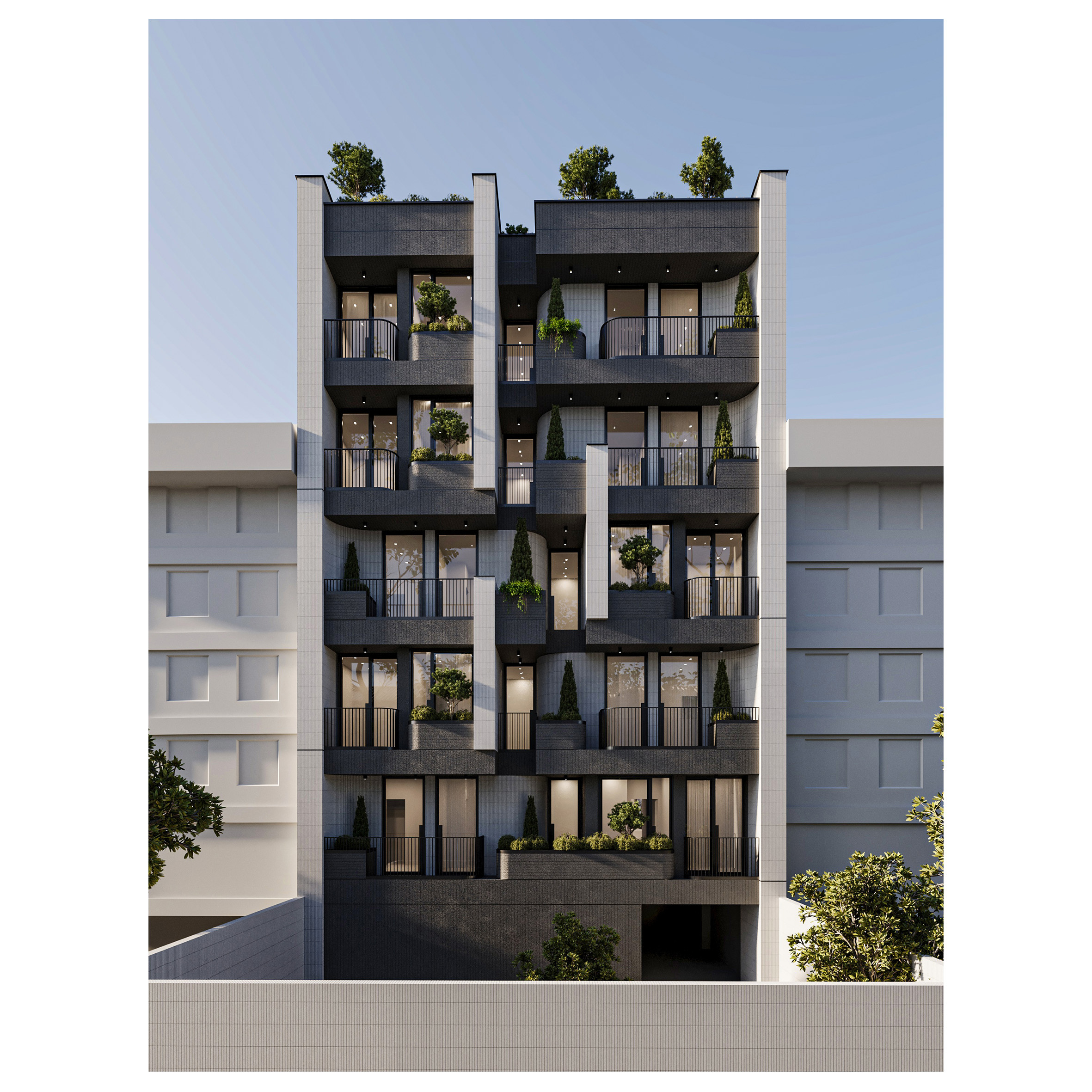 Arsa Apartment, housing two residential units on each floor, establishes a visual connection between the alleyway and the sky by utilizing vertical elements. Large, furnished terraces extend along the living space of the units and, in combination with greenery, create a pleasant experience of semi-open living continuously connected with nature. Furthermore, the project’s roof garden is designed as an extension of its facade, forming a unified and coherent whole in harmony with other elements.