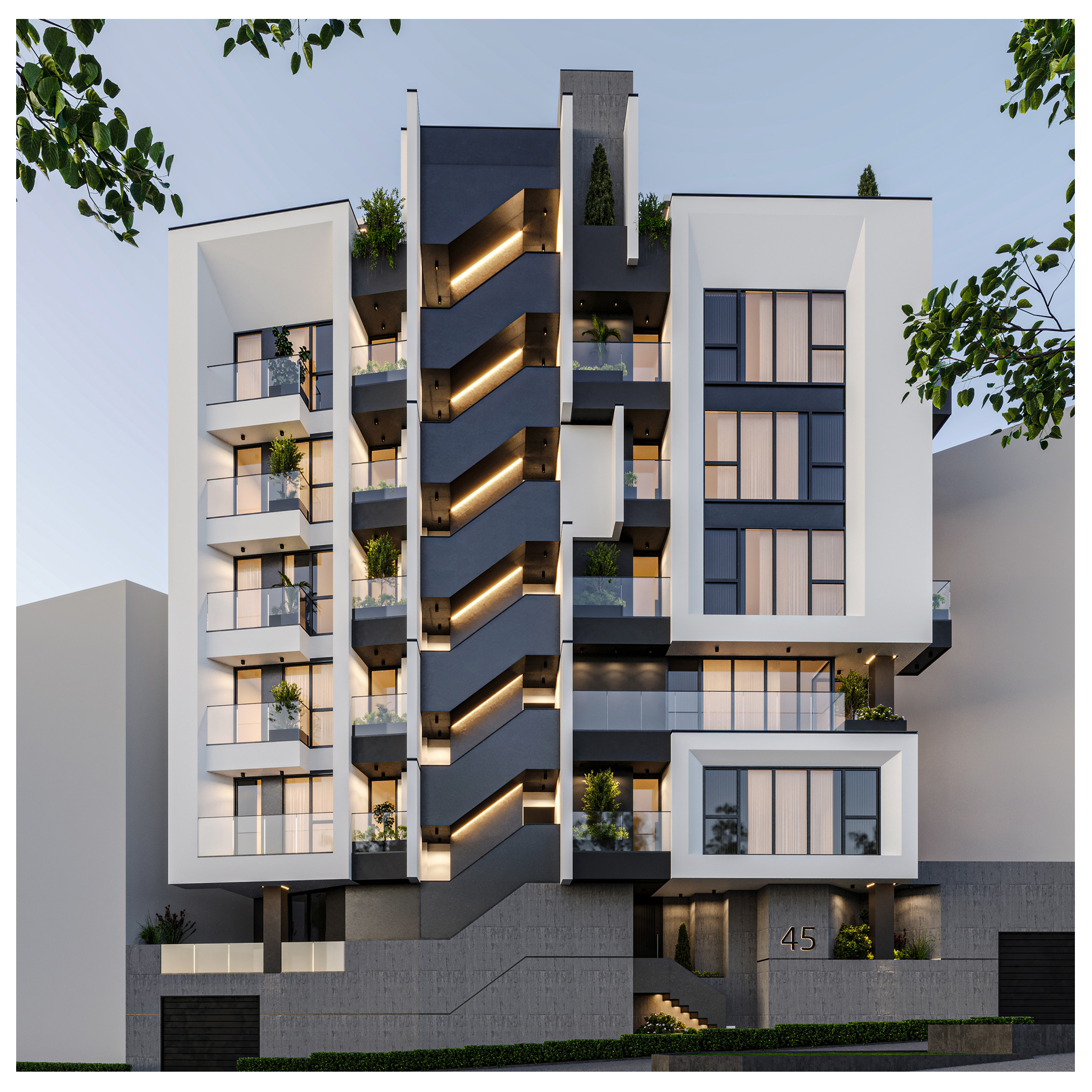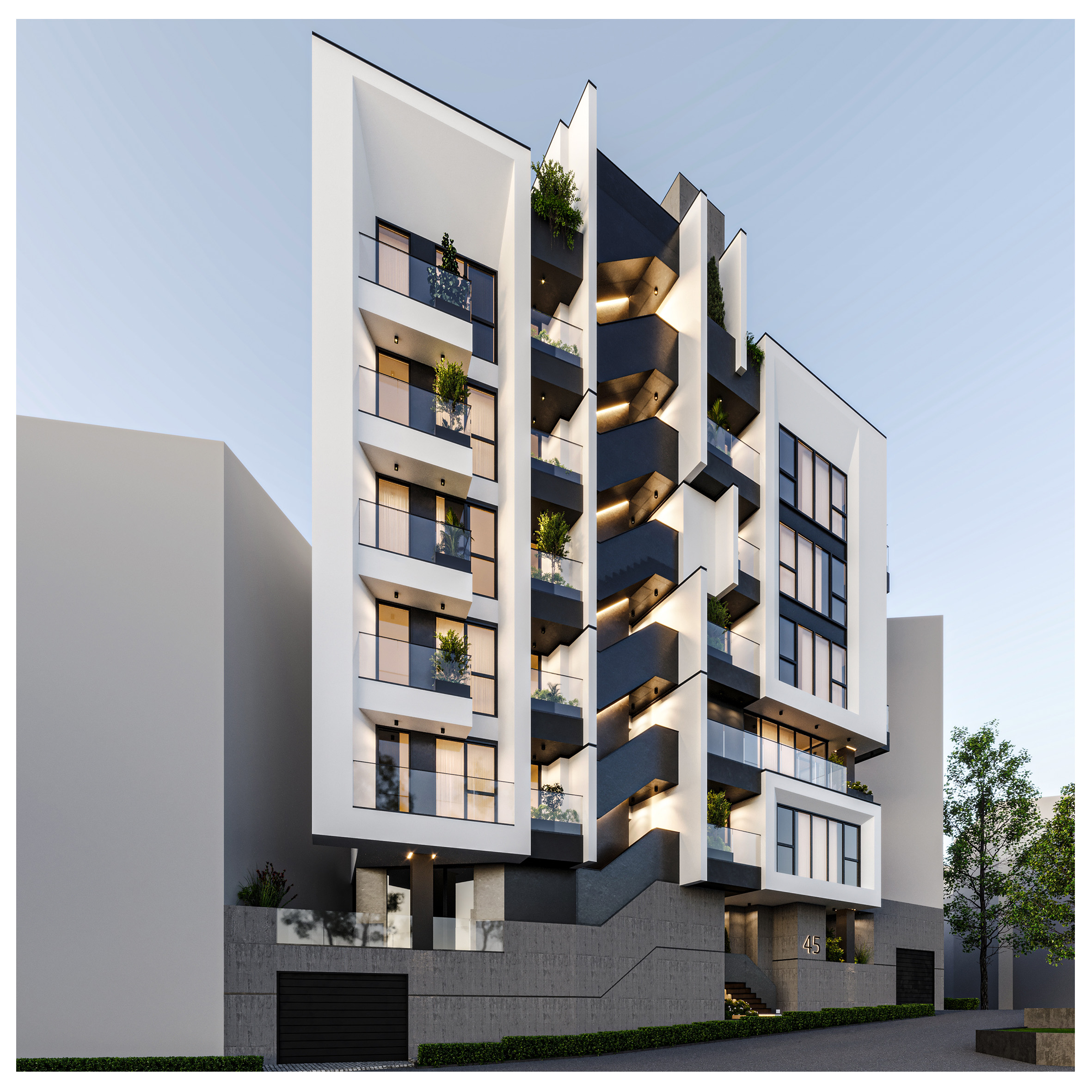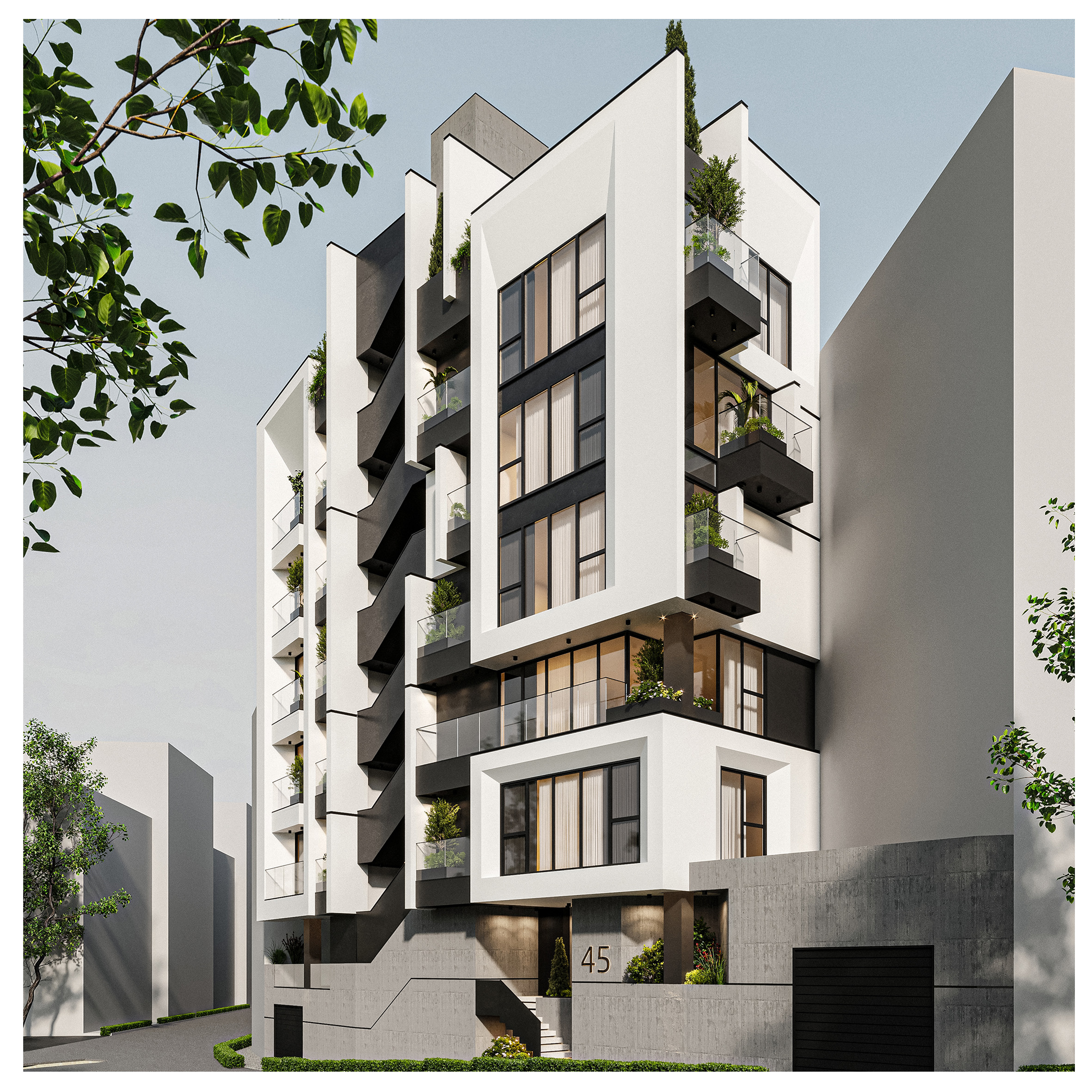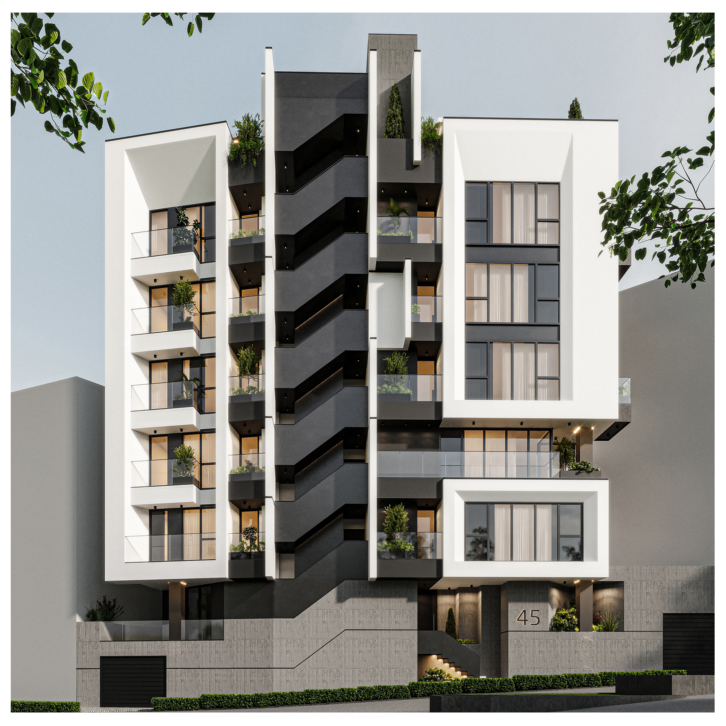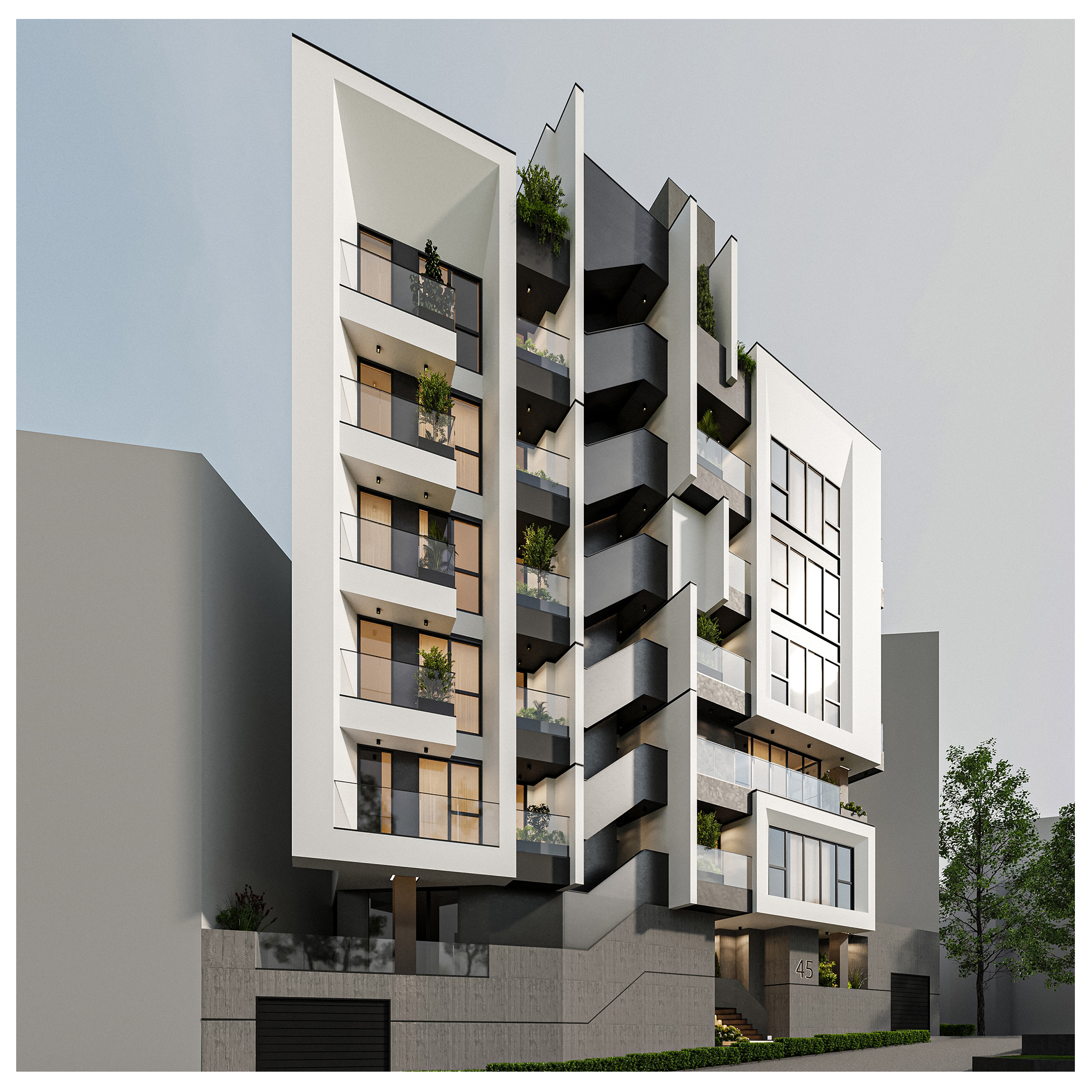 The Dezashib project is based on an asymmetrical and triangular platform; a plot of land that, from the very beginning, presented the architect with special challenges in siting, spatial organization, and facade design. The first step was to define the boundaries of the building mass; a form that was extracted from the limitations of the land and shaped the overall structure of the plan. The central core, including the elevator box and staircase, was placed in the middle of the plan, taking into account access and parking requirements, and subsequently became a prominent and iconic element in the facade; a vertical element that strengthens the spatial coherence of the project. Residential units are designed with full-length windows and wide openings to maximize the use of natural light and improve the quality of living.