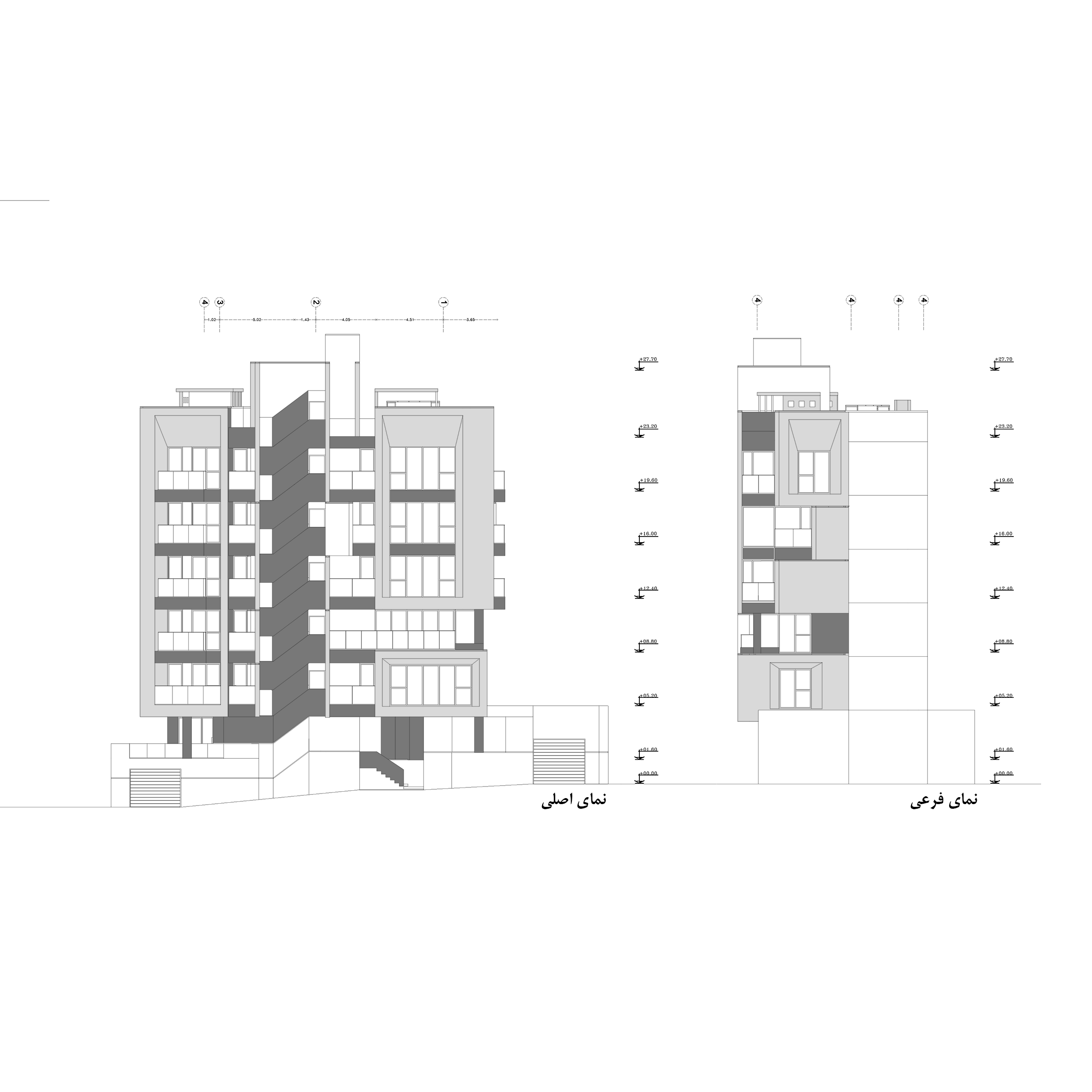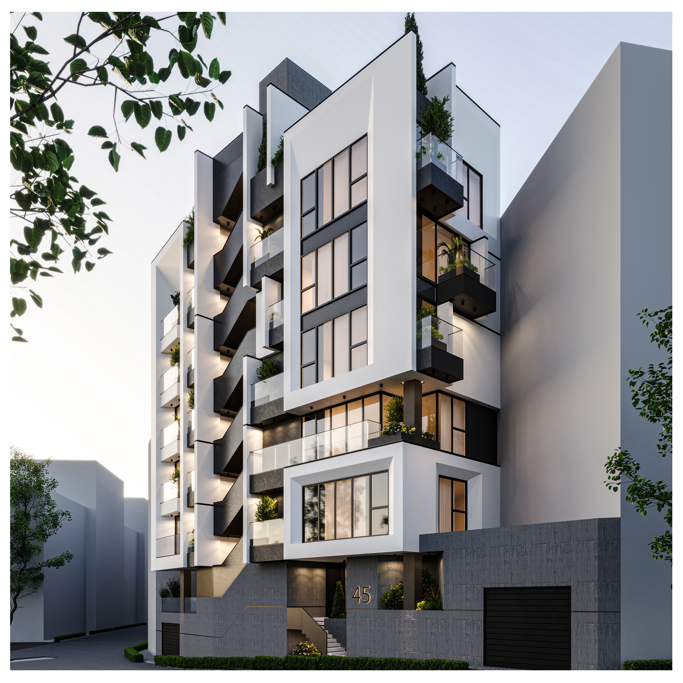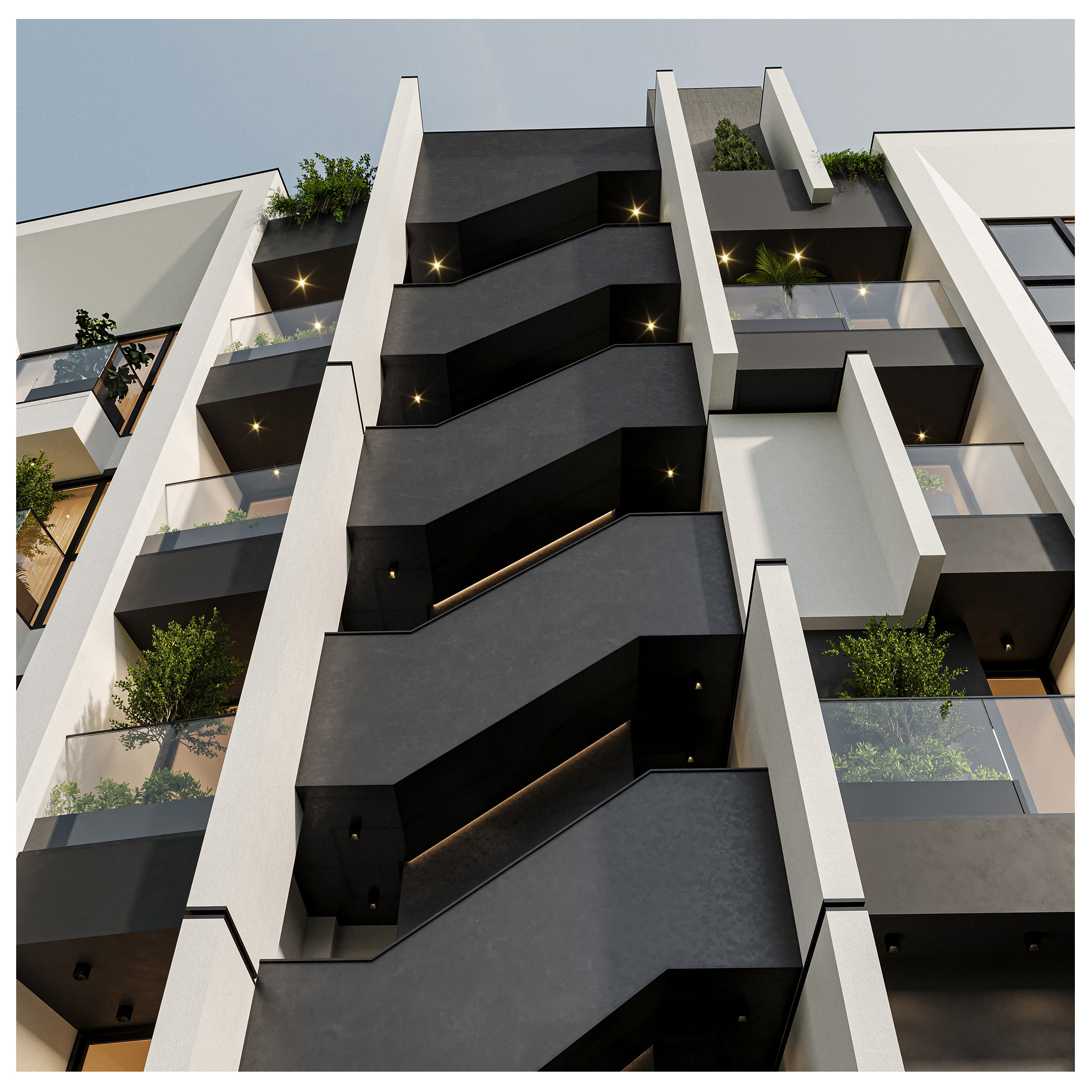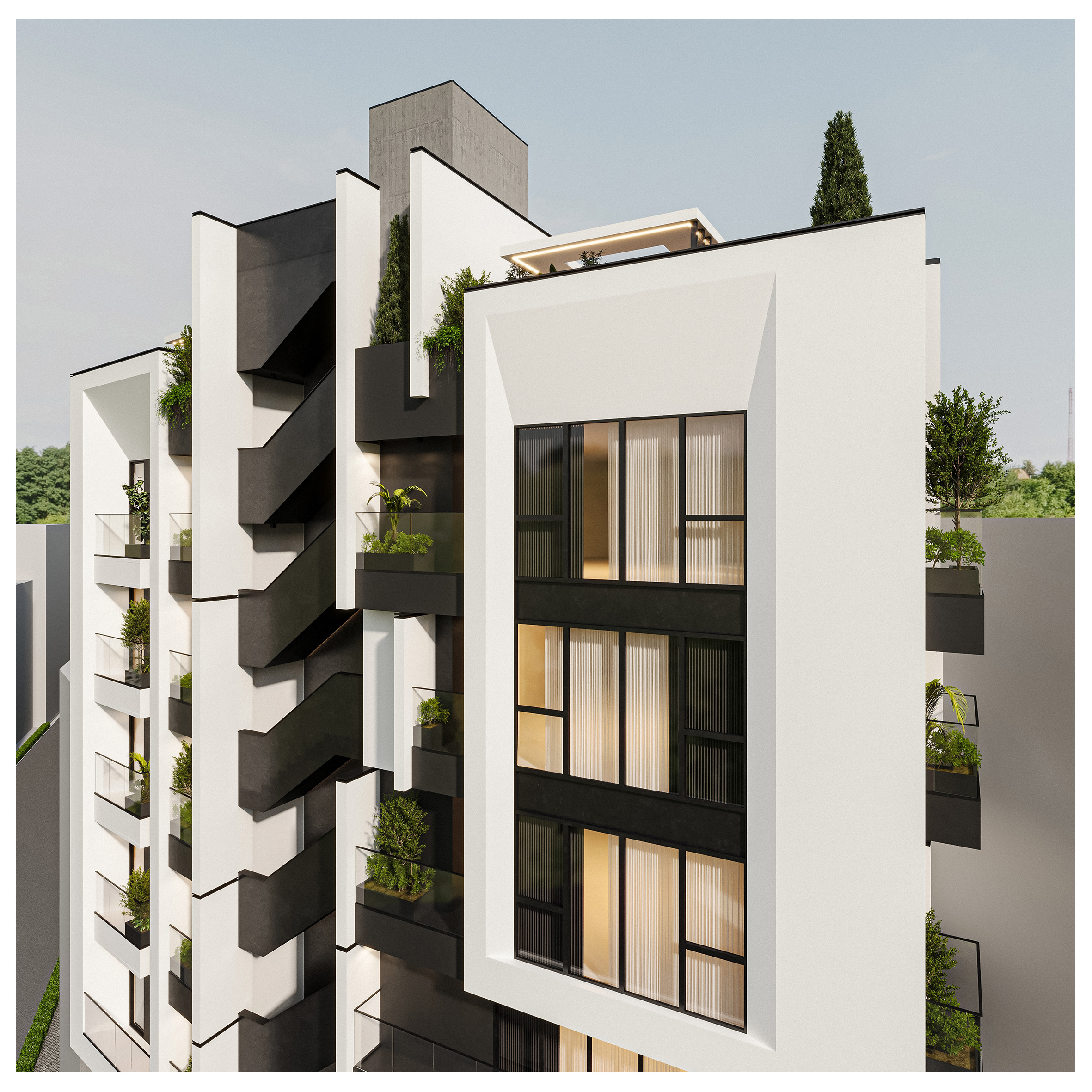 The Dezashib project is based on an asymmetrical and triangular platform; a plot of land that, from the very beginning, presented the architect with special challenges in siting, spatial organization, and facade design. The first step was to define the boundaries of the building mass; a form that was extracted from the limitations of the land and shaped the overall structure of the plan. The central core, including the elevator box and staircase, was placed in the middle of the plan, taking into account access and parking requirements, and subsequently became a prominent and iconic element in the facade; a vertical element that strengthens the spatial coherence of the project. Residential units are designed with full-length windows and wide openings to maximize the use of natural light and improve the quality of living.