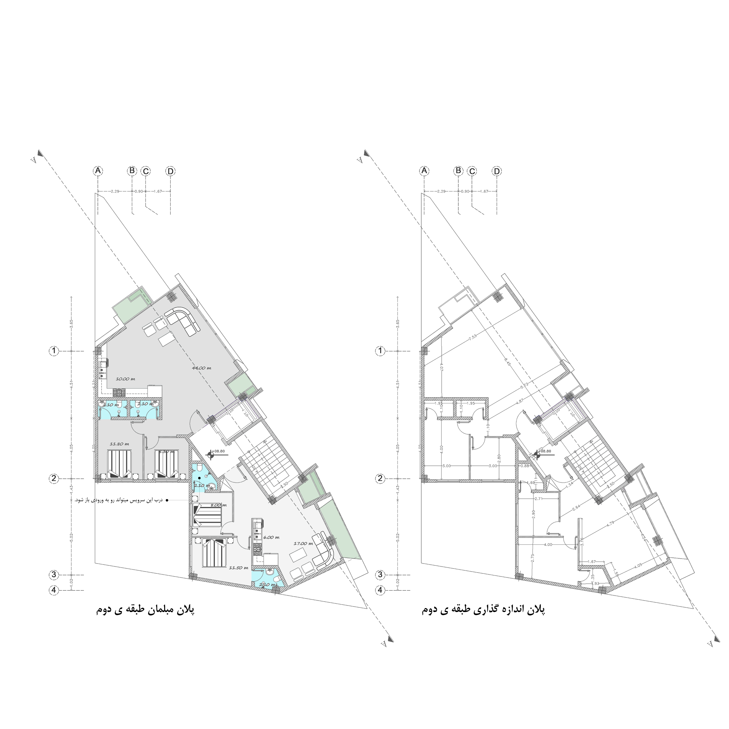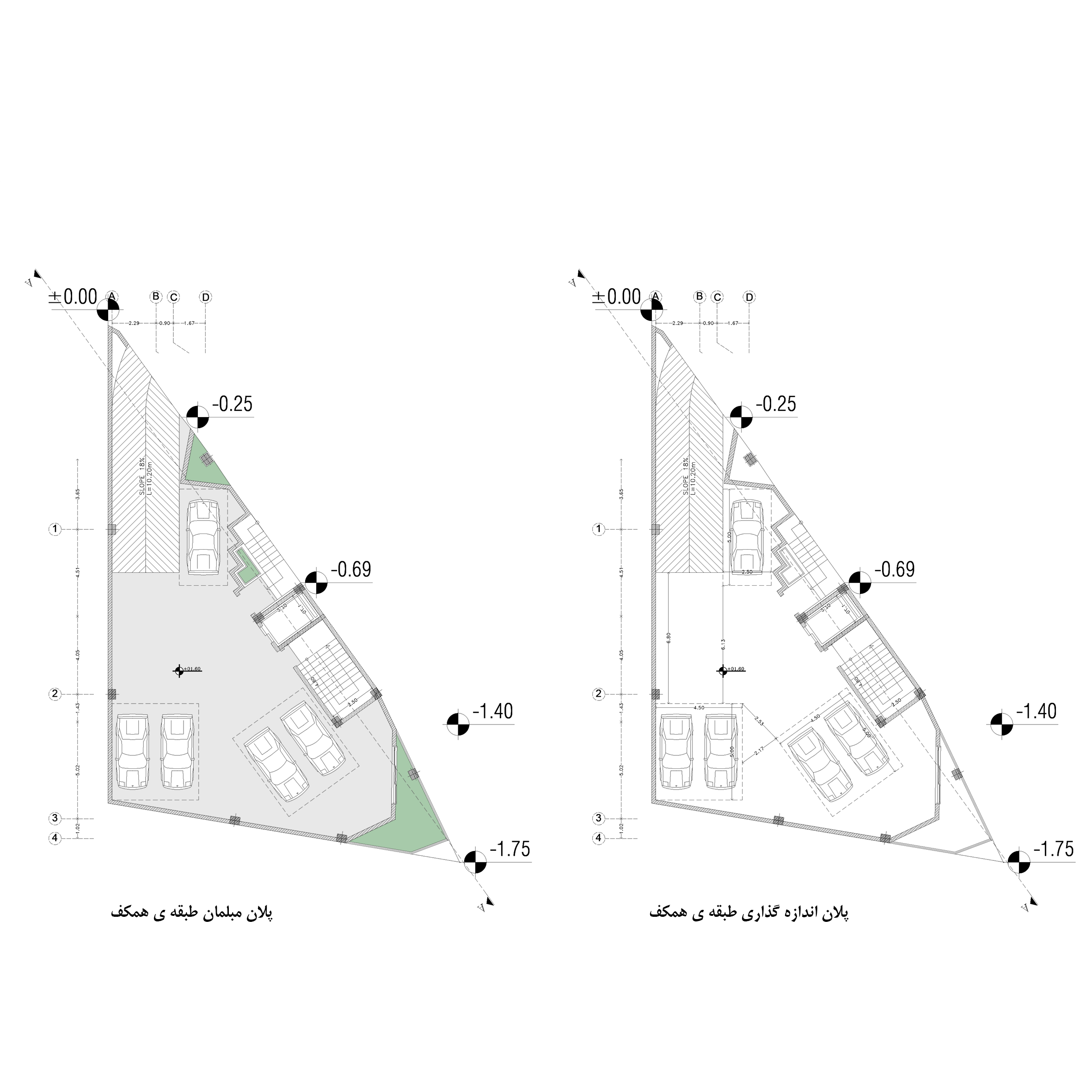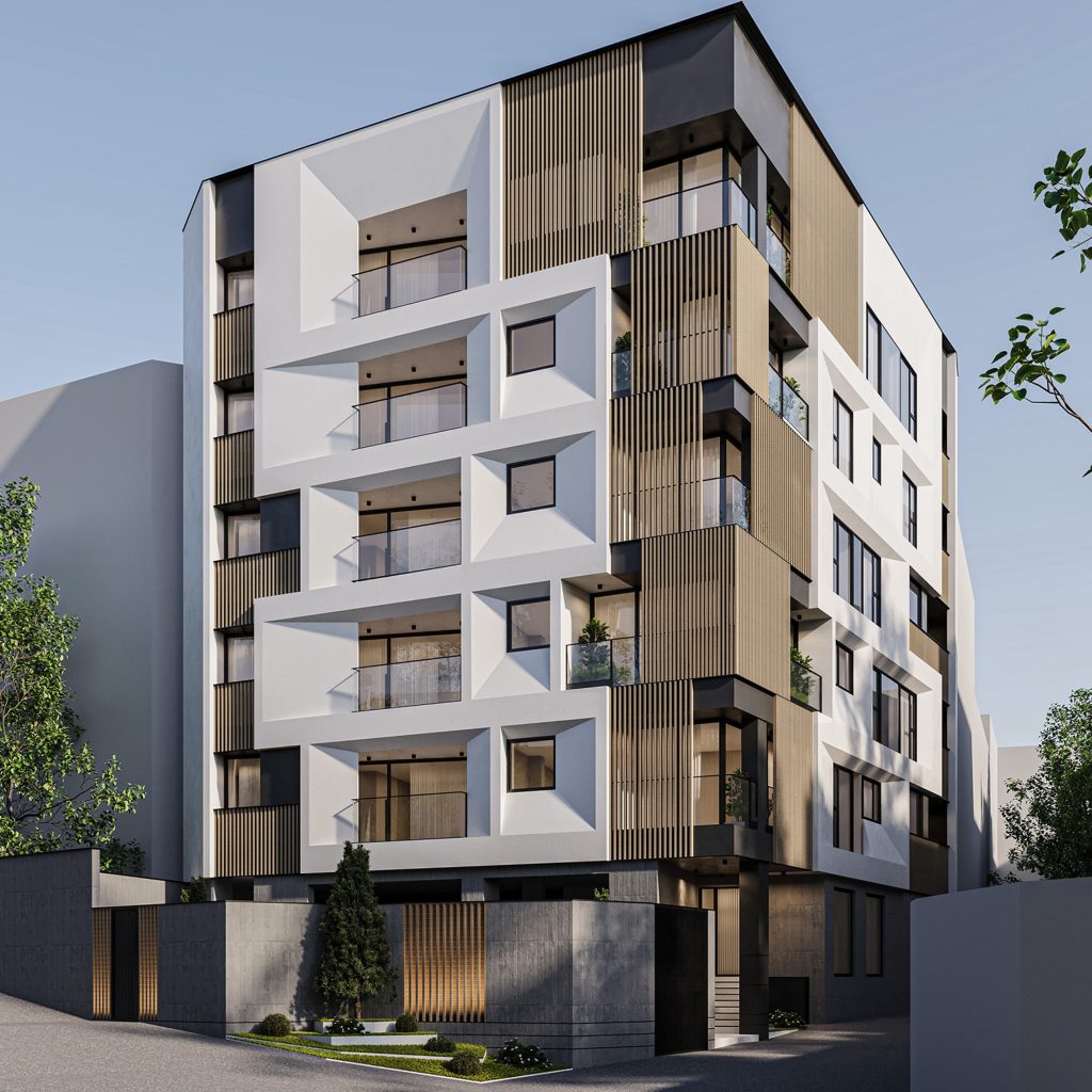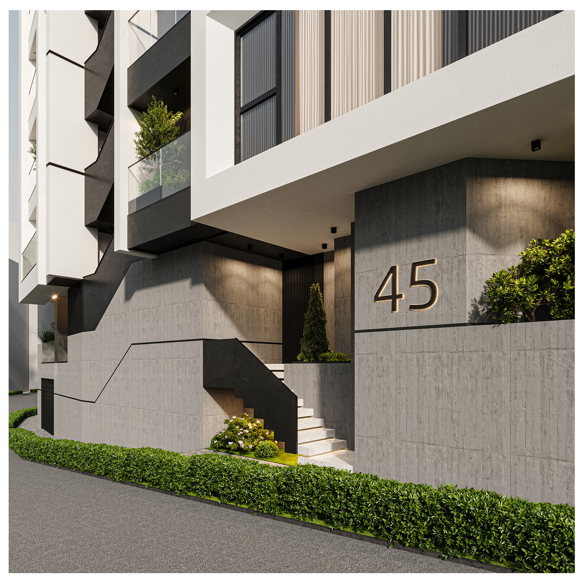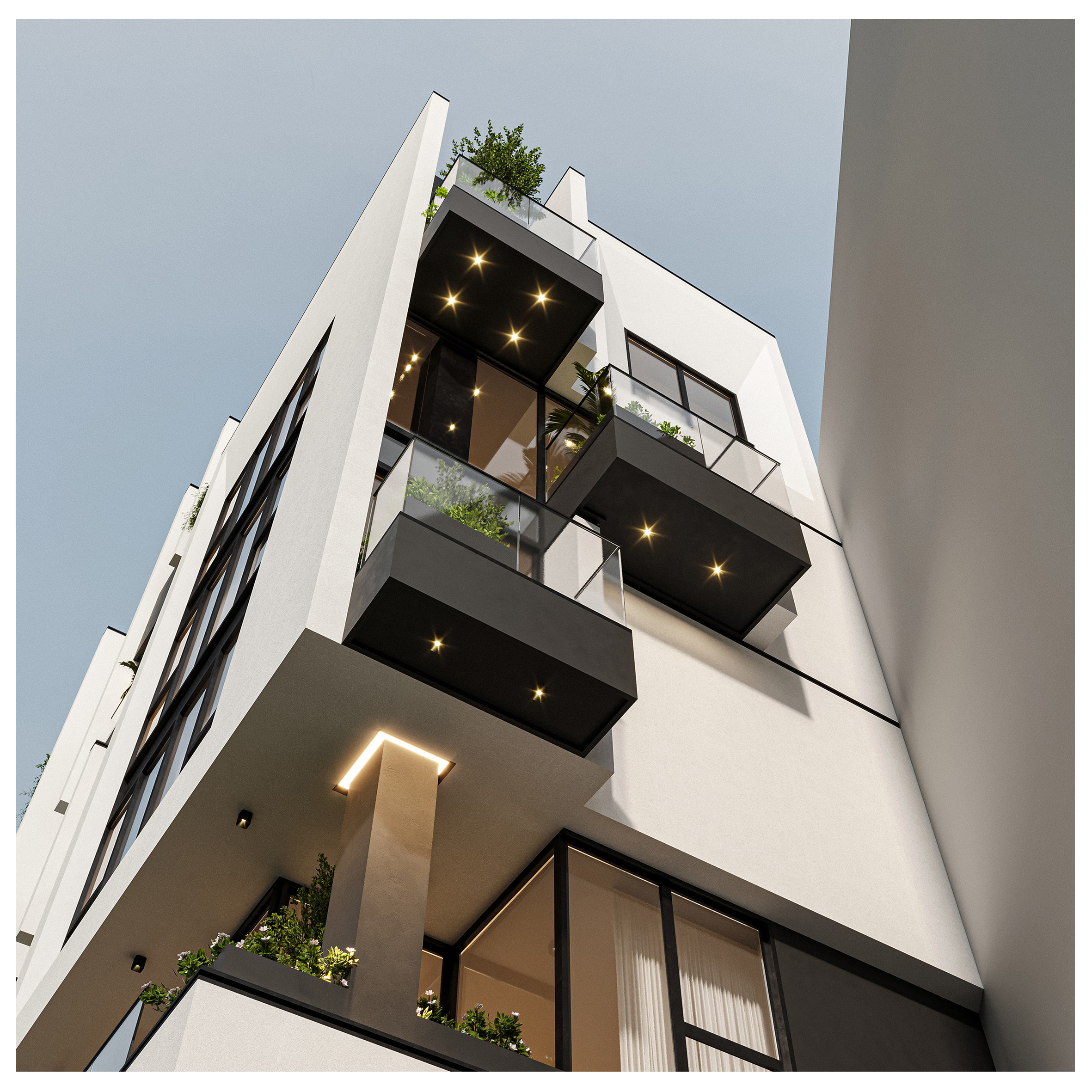 The Dezashib project is based on an asymmetrical and triangular platform; a plot of land that, from the very beginning, presented the architect with special challenges in siting, spatial organization, and facade design. The first step was to define the boundaries of the building mass; a form that was extracted from the limitations of the land and shaped the overall structure of the plan. The central core, including the elevator box and staircase, was placed in the middle of the plan, taking into account access and parking requirements, and subsequently became a prominent and iconic element in the facade; a vertical element that strengthens the spatial coherence of the project. Residential units are designed with full-length windows and wide openings to maximize the use of natural light and improve the quality of living.