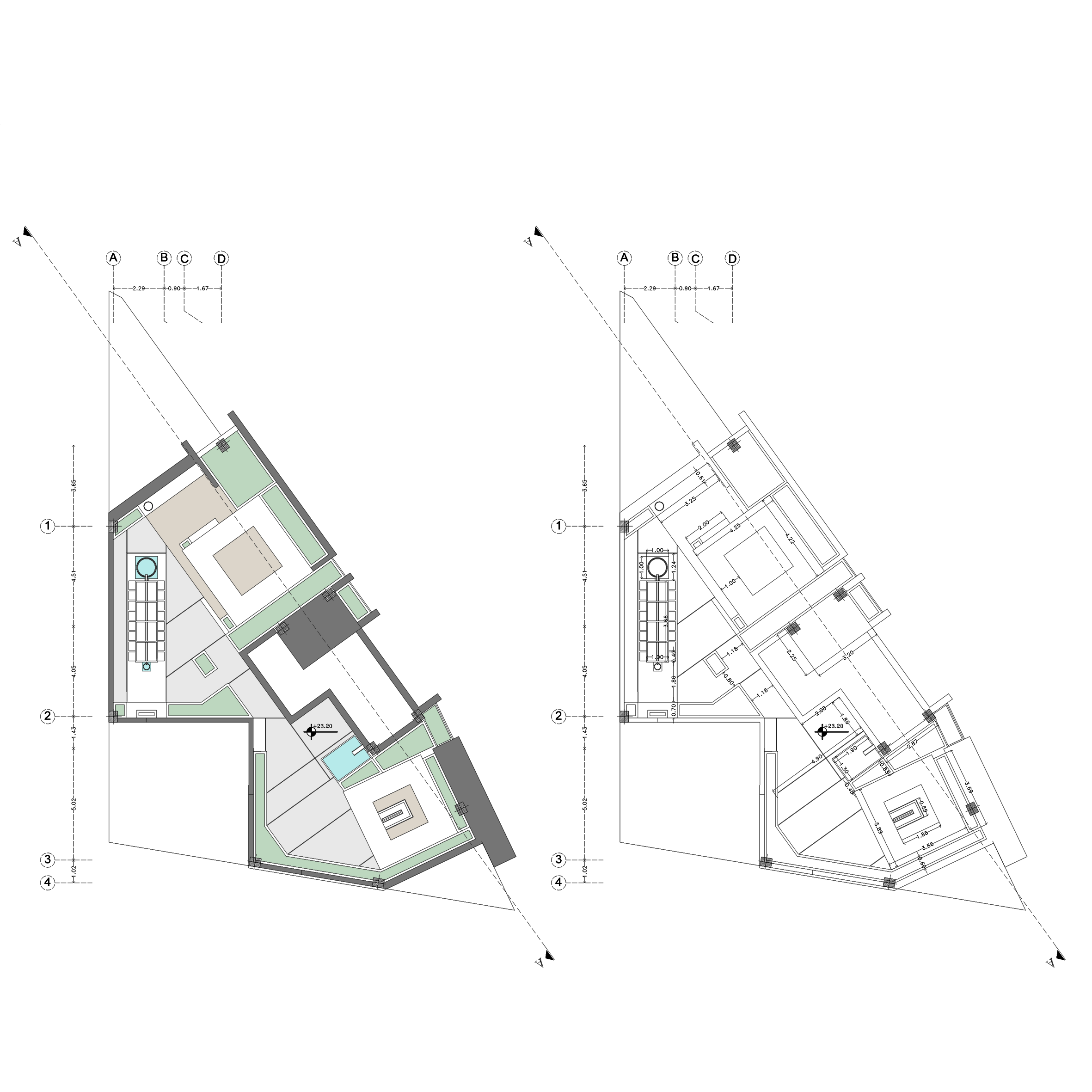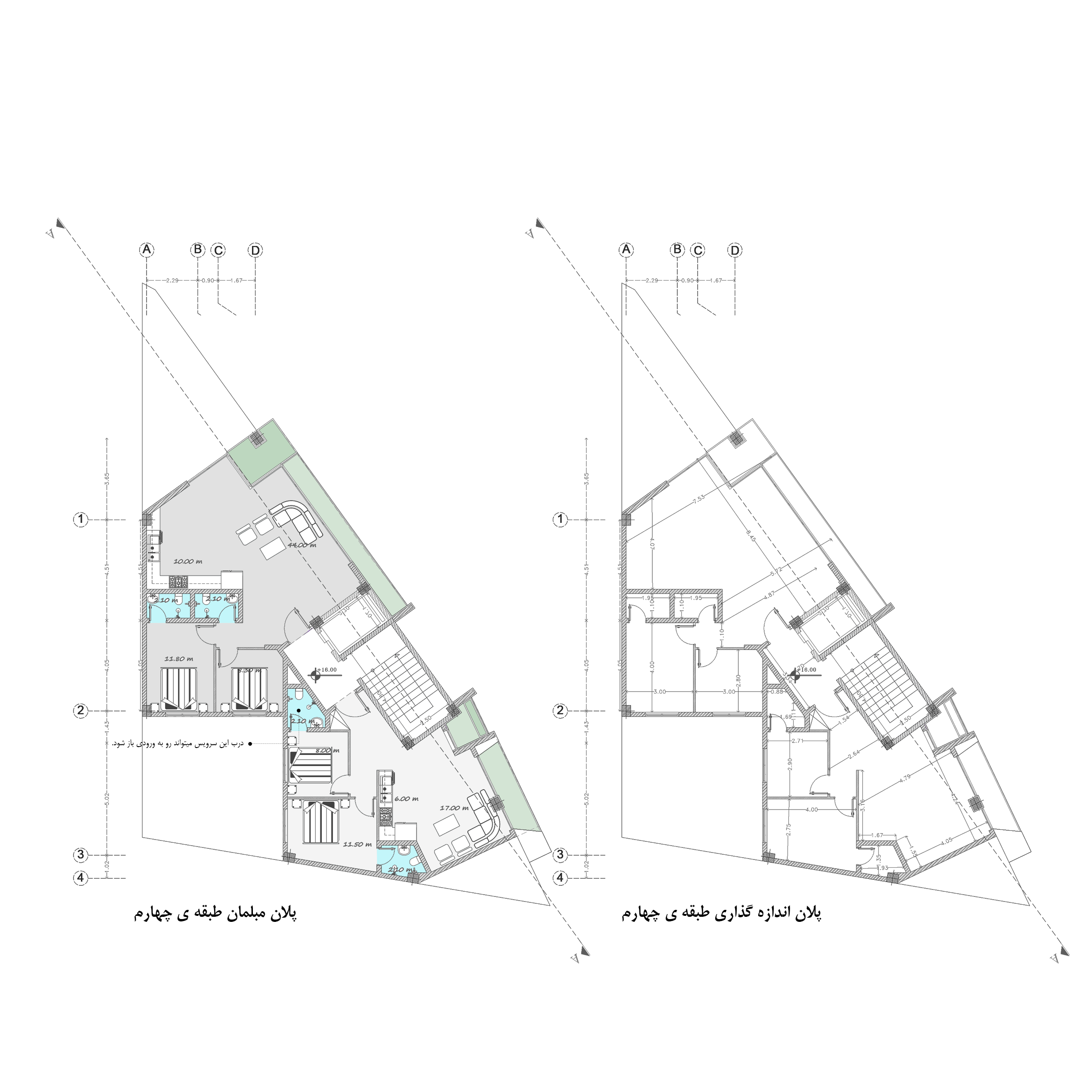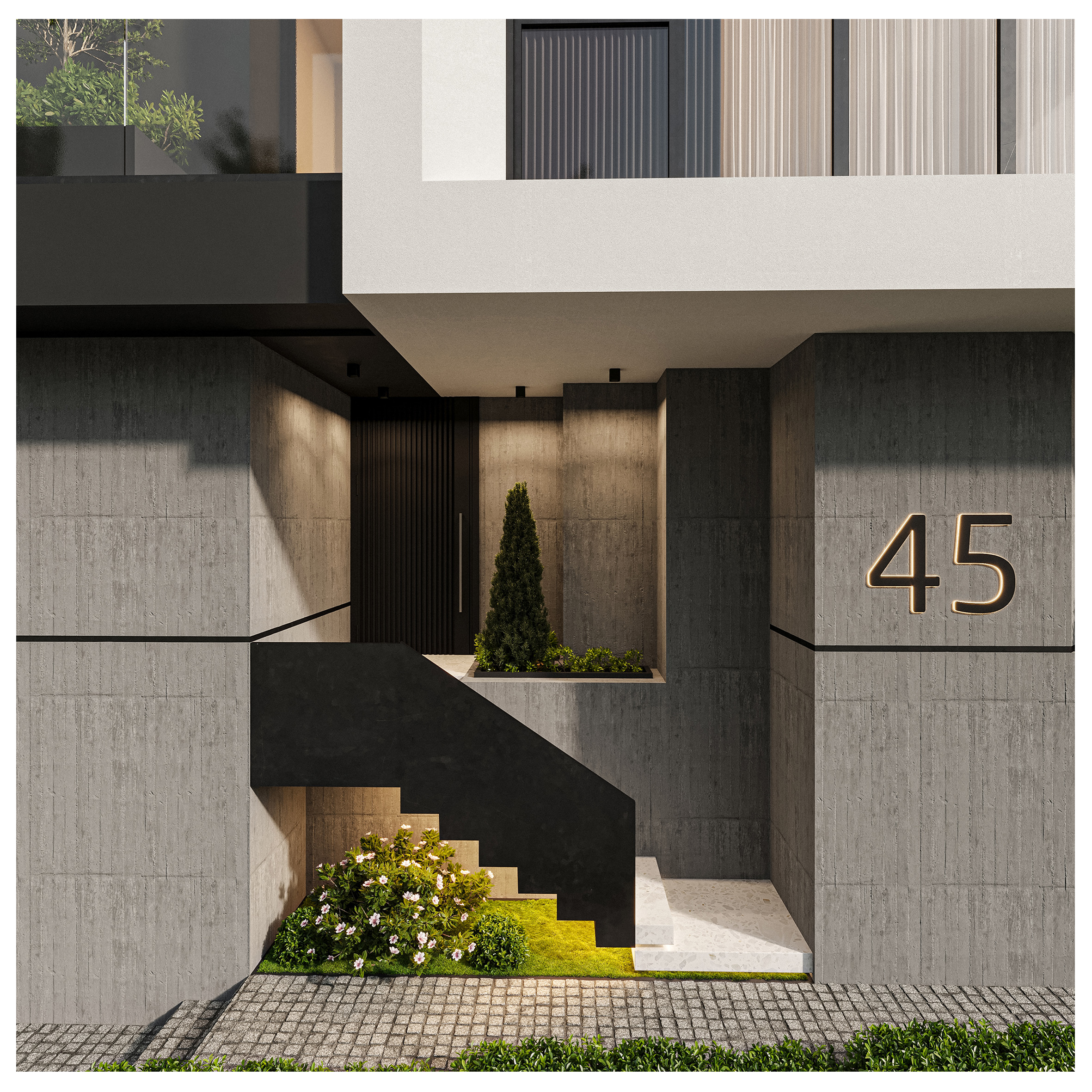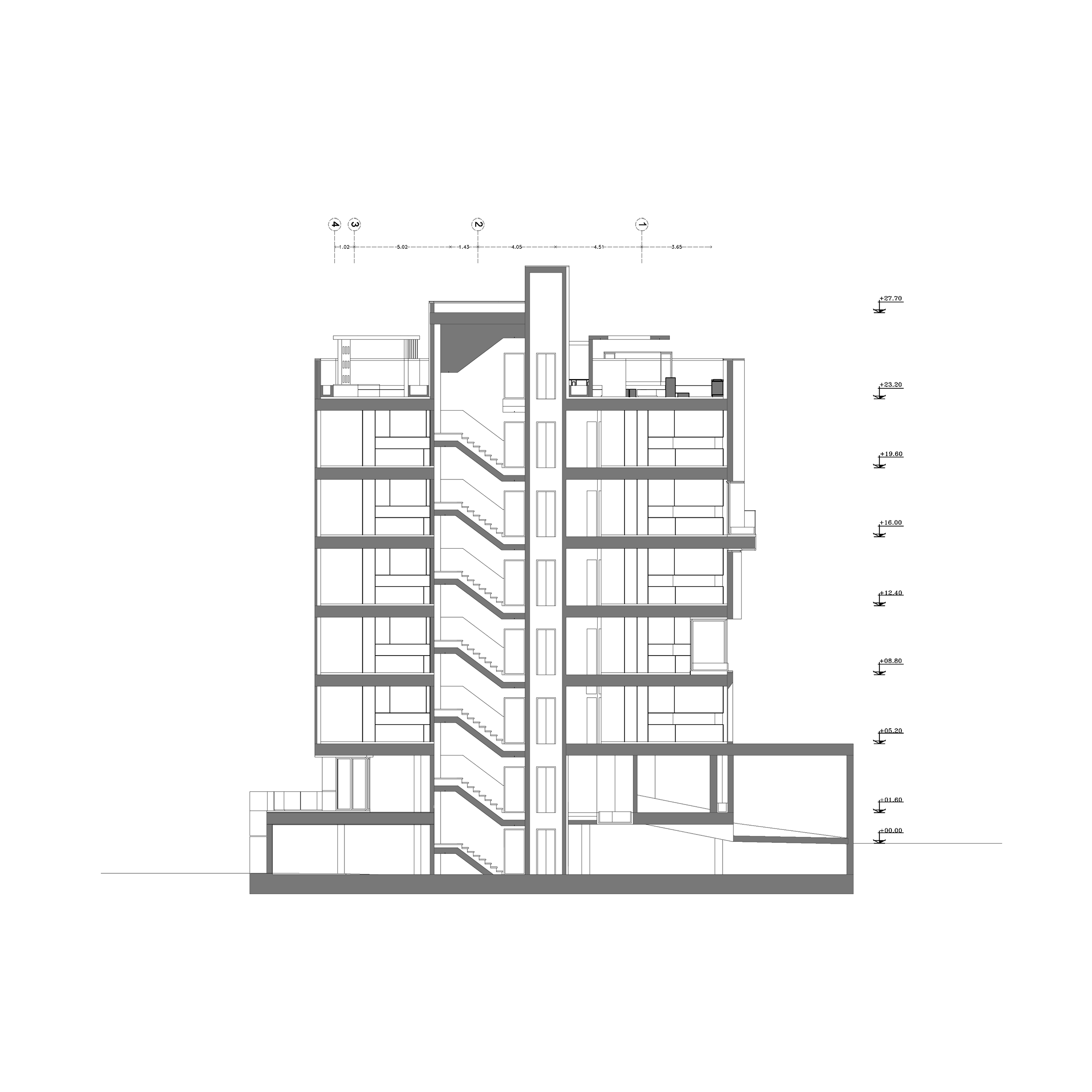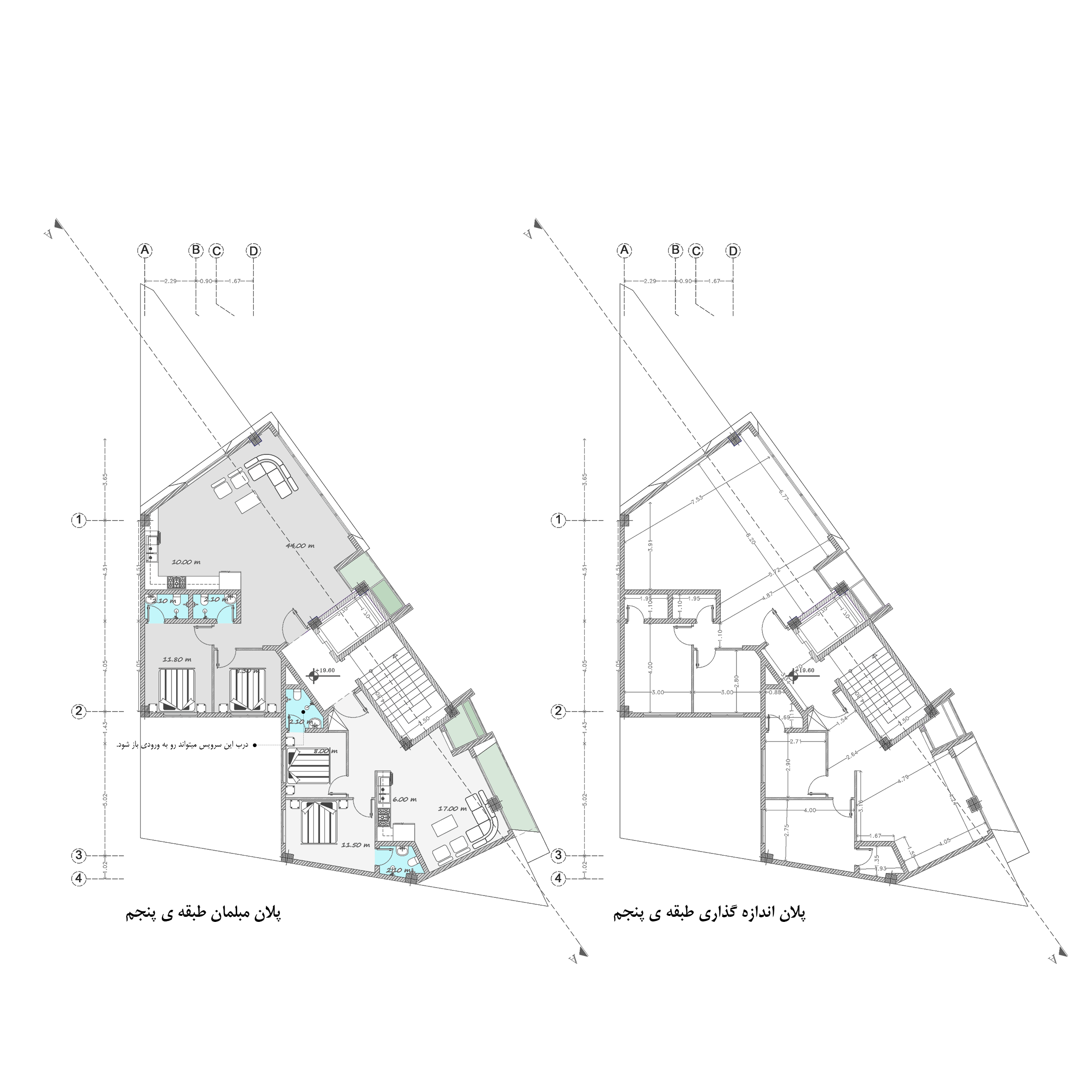 The Dezashib project is based on an asymmetrical and triangular platform; a plot of land that, from the very beginning, presented the architect with special challenges in siting, spatial organization, and facade design. The first step was to define the boundaries of the building mass; a form that was extracted from the limitations of the land and shaped the overall structure of the plan. The central core, including the elevator box and staircase, was placed in the middle of the plan, taking into account access and parking requirements, and subsequently became a prominent and iconic element in the facade; a vertical element that strengthens the spatial coherence of the project. Residential units are designed with full-length windows and wide openings to maximize the use of natural light and improve the quality of living.